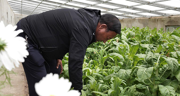 巴珠在察看蔬菜的長勢。新華網(wǎng) 旦增努布 攝