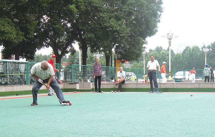 8月24日,幾名老年人在籃球城旁邊的門球場上打門球。