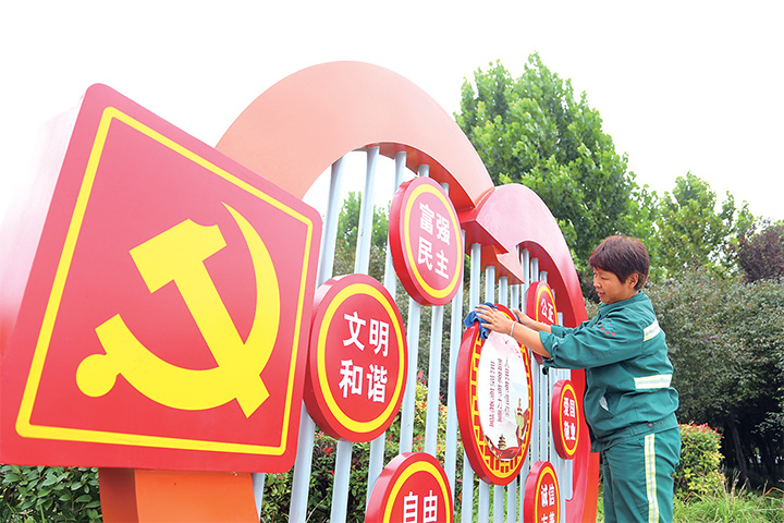 園林工人在擦拭社會主義核心價(jià)值觀宣傳墻