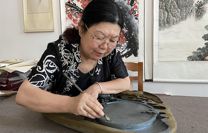 出于對藝術(shù)和傳統(tǒng)文化的熱愛,自此之后,李喜連每天都會抽出時(shí)間向王天才請教?!耙婚_始,他還不愿意教我,說制作天壇硯不僅得設(shè)計(jì)、雕刻,還得上山采料、選料等,有很多環(huán)節(jié),怕我一個(gè)女孩子堅(jiān)持不下來?!崩钕策B笑著說,經(jīng)過多次與王天才交流,最終她如愿拜到王天才門下,跟隨他學(xué)習(xí)繪畫藝術(shù)和天壇硯的設(shè)計(jì)與雕刻。