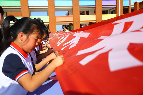 學(xué)生在條幅上簽名