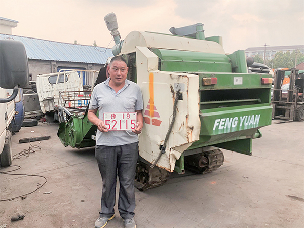 王久常領(lǐng)取到報(bào)廢補(bǔ)貼金后和報(bào)廢收割機(jī)合影留念