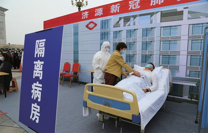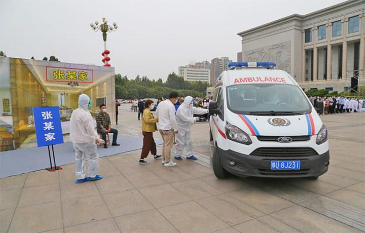 演練模擬背景為9月17日,張某從中高風險地區(qū)歸來后,按照規(guī)定居家隔離。10天后,張某出現(xiàn)發(fā)熱37.5℃、咳嗽、乏力、氣短、頭痛等癥狀。社區(qū)工作人員立即向沁園街道疫情防控指揮部報告病人情況,工作人員隨即聯(lián)系中醫(yī)院轉(zhuǎn)診車,張某在妻子陪同下很快被送到濟源示范區(qū)新冠肺炎救治中心就診。