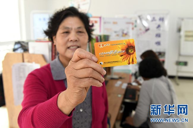 在河南省新鄉(xiāng)市高新技術(shù)產(chǎn)業(yè)開發(fā)區(qū)老年大學(xué),一名老人在展示剛剛辦理的12349敬老積分卡(2016年10月19日攝)。