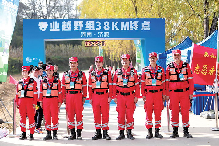 據(jù)裁判員劉善舉介紹,全線38公里共設有7個補給站,可提供食物、水、鹽補給等服務。裁判員分為3組,每組5人左右,負責各區(qū)域賽道路段的布線、巡線、執(zhí)裁,及志愿者的培訓、安排等工作。賽道沿線至少每隔1.5公里有一名志愿者,為參賽選手指引路線,關注選手的身體狀況等。