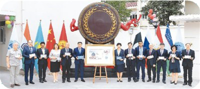 6月15日,上海合作組織睦鄰友好合作委員會(huì)與中華全國集郵聯(lián)合會(huì)共同發(fā)行公益紀(jì)念封700套。圖為嘉賓代表手持紀(jì)念封合影。新華社記者 李賀 攝