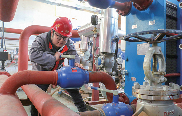工作人員在供熱首站進(jìn)行設(shè)備調(diào)試檢查