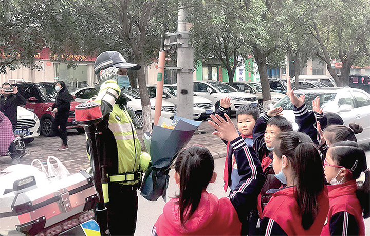 11月23日早上,沁園路小學的7名學生代表,手捧鮮花列隊走近校門外正在執(zhí)勤的鐵騎隊員,向他彎腰鞠躬,并送上鮮花,轉達全體師生對他們的感謝。這溫馨的一幕不僅感動了鐵騎隊員,還感動了在場的許多學生、家長。記者 杜婷婷 攝
