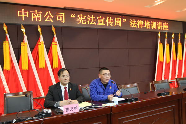 在第7個國家憲法日來臨之際,為弘揚憲法精神,發(fā)揮司法服務(wù)經(jīng)濟的作用,推進法治化的營商環(huán)境建設(shè),為地方經(jīng)濟發(fā)展提供有力的司法保障,12月2日下午,方城縣人民法院審委會委員、民一庭庭長曹天祥應(yīng)邀到中南鉆石有限公司(下稱中南公司)為企業(yè)干部職工開展送法進企業(yè)活動,進行專題講座,該公司領(lǐng)導(dǎo)班子成員、中層管理人員、重點崗位人員共計120余人聆聽了講座。