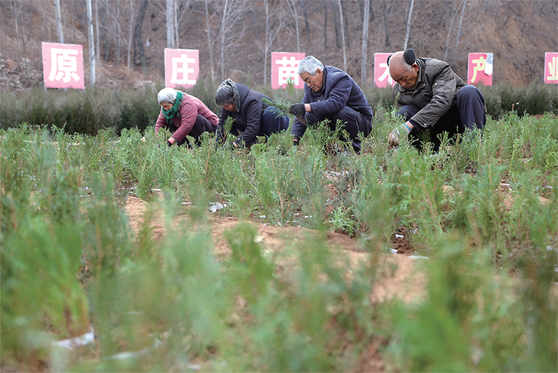 12月11日,在王屋鎮(zhèn)原莊村,村民在移栽苗木。