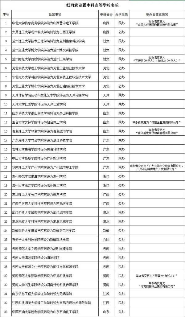 教育部發(fā)展規(guī)劃司表示,根據(jù)《高等教育法》《普通高等學(xué)校設(shè)置暫行條例》《普通本科學(xué)校設(shè)置暫行規(guī)定》和《關(guān)于加快推進(jìn)獨(dú)立學(xué)院轉(zhuǎn)設(shè)工作的實(shí)施方案》等法律法規(guī)政策規(guī)定,經(jīng)第七屆全國(guó)高等學(xué)校設(shè)置評(píng)議委員會(huì)專(zhuān)家考察和評(píng)議,并經(jīng)黨組會(huì)審議,擬同意33所獨(dú)立學(xué)院轉(zhuǎn)設(shè)為獨(dú)立設(shè)置的本科學(xué)校,現(xiàn)將學(xué)校名單等信息向社會(huì)公示?! ?/p>