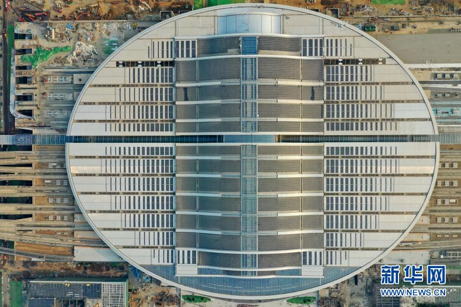 12月26日拍攝的京雄城際鐵路雄安站,橢圓形屋頂是一座光伏電站(無(wú)人機(jī)照片)。新華社記者 牟宇 攝