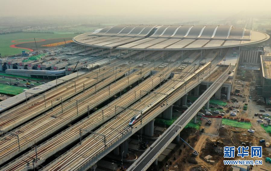 12月26日,用于測(cè)試的動(dòng)車組列車駛離京雄城際鐵路雄安站(無(wú)人機(jī)照片)。新華社記者 牟宇 攝