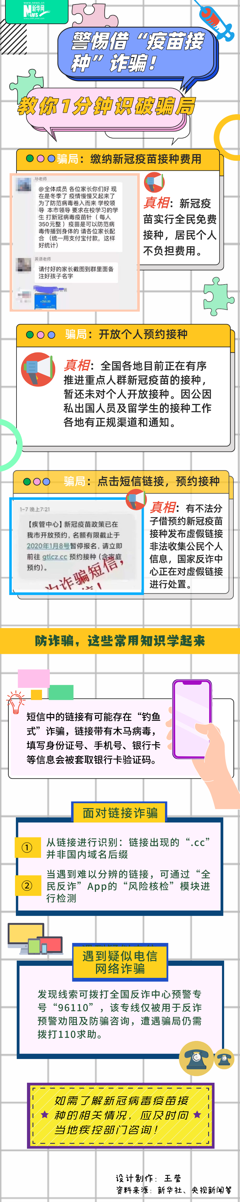 近期,全國多地有序開展新冠病毒疫苗接種,一些不法分子從中嗅到了“機(jī)會(huì)”,借疫苗接種設(shè)局實(shí)施詐騙,快來識(shí)破這些騙局!
