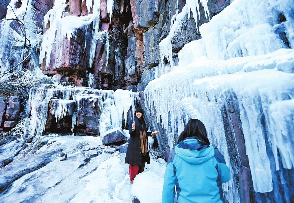 1月12日,游客在位于濟(jì)源大峪鎮(zhèn)亂石村的大型冰掛前拍照游玩。記者 成利軍 攝