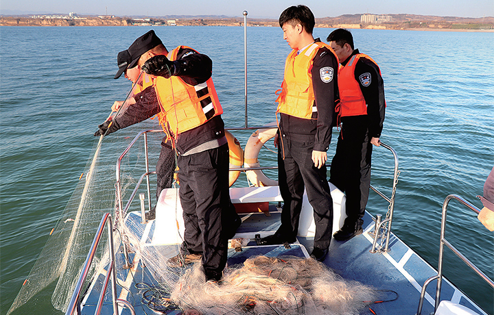 1月25日,小浪底公安局水警大隊民警正在拆除大型非法捕撈漁網(wǎng)。