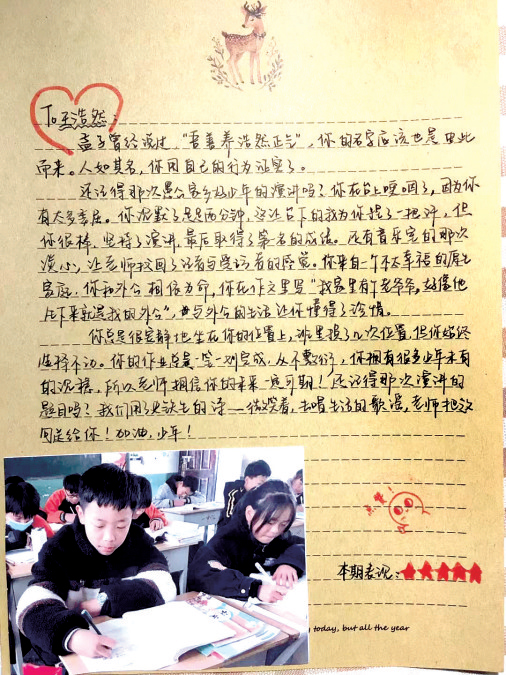 1月25日,在邵原一中校園里,記者翻看史偉娜寫給全班學(xué)生的信發(fā)現(xiàn),從信封到信紙,再到精美圖章,以及為本學(xué)期表現(xiàn)評(píng)級(jí)的手畫小星星,處處可見(jiàn)用心程度。