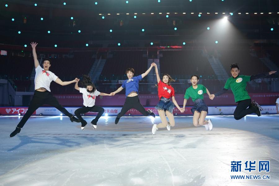 這是2020年11月8日,中國(guó)冰舞組合王詩(shī)玥(左二)/柳鑫宇(左一)、男單選手金博洋(左三)、女單選手陳虹伊(右三)、雙人滑組合彭程(右二)/金楊在2020中國(guó)杯世界花樣滑冰大獎(jiǎng)賽為觀眾表演后合影。新華社記者 鞠煥宗 攝