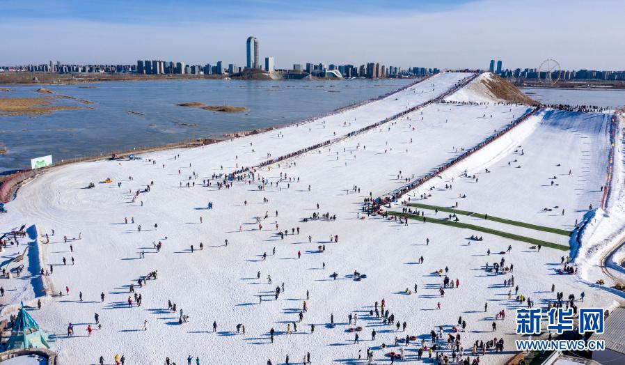 這是2021年1月30日,市民在寧夏銀川市閱?;﹫?chǎng)體驗(yàn)冰雪項(xiàng)目(無(wú)人機(jī)照片)。新華社記者 馮開(kāi)華 攝