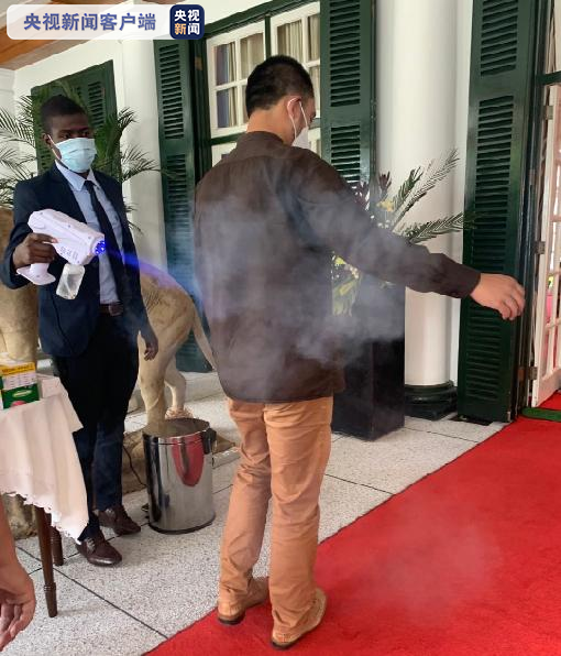 △專訪總統(tǒng)前,工作人員又對(duì)記者進(jìn)行體溫檢測(cè),并用高科技噴霧槍進(jìn)行全方位消毒