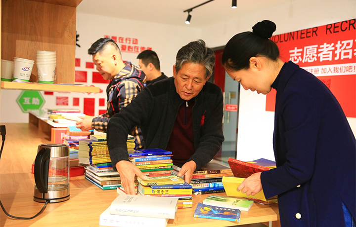 2月23日,熱心志愿者賈善忠正在介紹圖書。