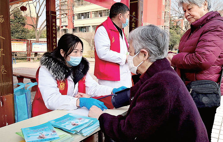 醫(yī)療志愿者為居民進(jìn)行體檢