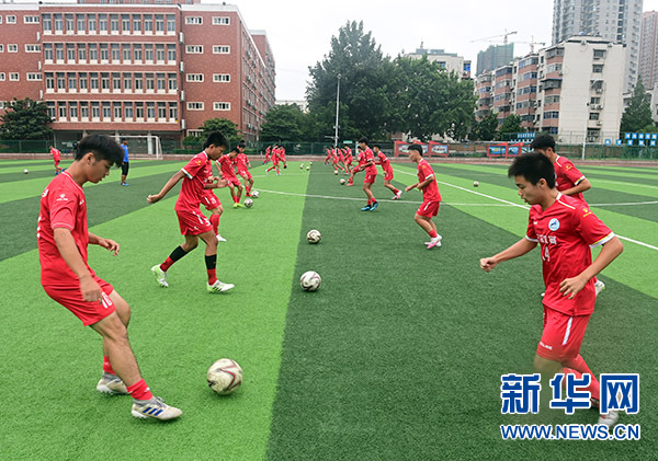 這是河南省實(shí)驗(yàn)中學(xué)高中足球隊(duì)隊(duì)員在進(jìn)行短傳練習(xí)(2020年7月22日攝)。新華社記者 李嘉南 攝