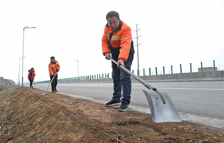 3月8日,公路養(yǎng)護人員在S307衛(wèi)柿線靈山至荊王段整修路肩。
