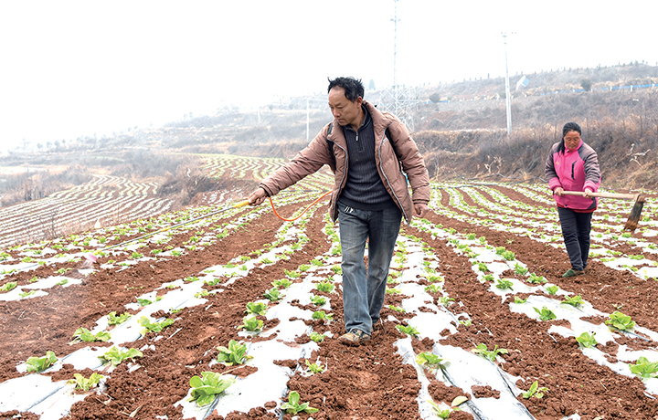 3月11日,河南省濟源市大峪鎮(zhèn)寺郎腰村農(nóng)民在田間為白菜種株打藥。