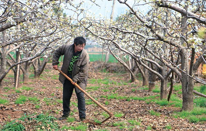 3月15日,在五龍口鎮(zhèn)西窯頭村,農(nóng)民在梨園里鋤草。