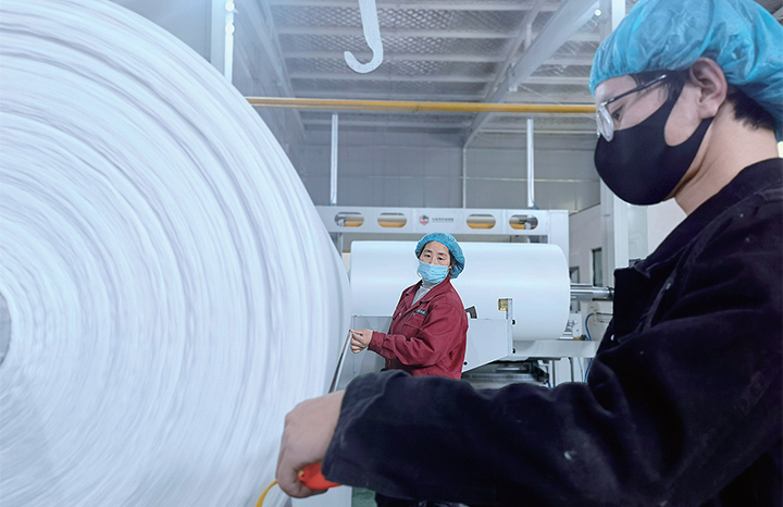 4月7日,濟源小浪底無紡布有限公司第二條水刺無紡布生產(chǎn)線正在開足馬力生產(chǎn)。