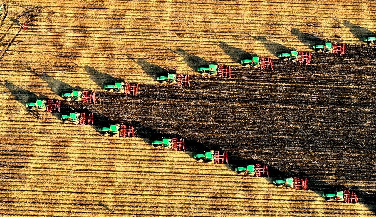 △2020年9月30日,北大荒集團(tuán)九三分公司尖山農(nóng)場、鶴山農(nóng)場的大豆、玉米、小麥田里幾十臺收獲機(jī)車、滅茬、整地機(jī)車列隊(duì)前進(jìn)。