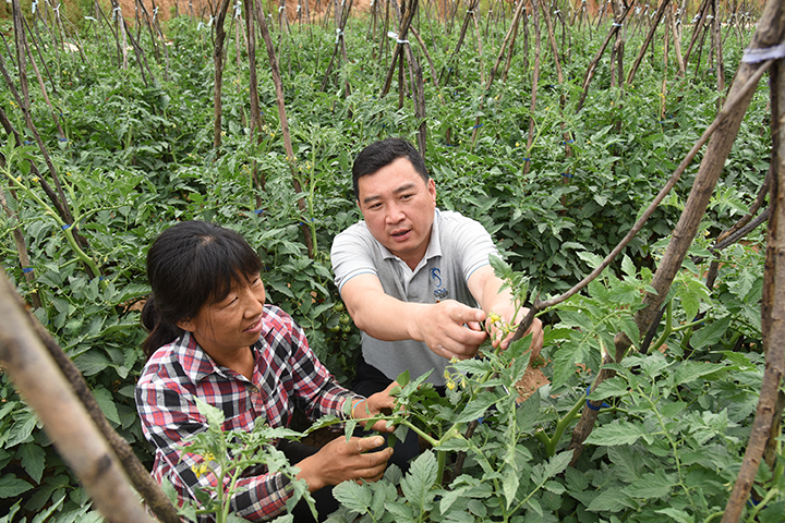 第一書記李永紅(右)查看西紅柿種植情況