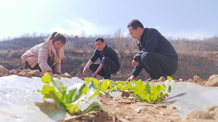 說話間,來到了張素蓮的莊稼地。頭一天剛下過雨,田里還頗為泥濘,李永紅帶著原波徑直走過去,蹲下、挑膜、扶根……一顆顆白菜苗破膜而出,鮮嫩欲滴。