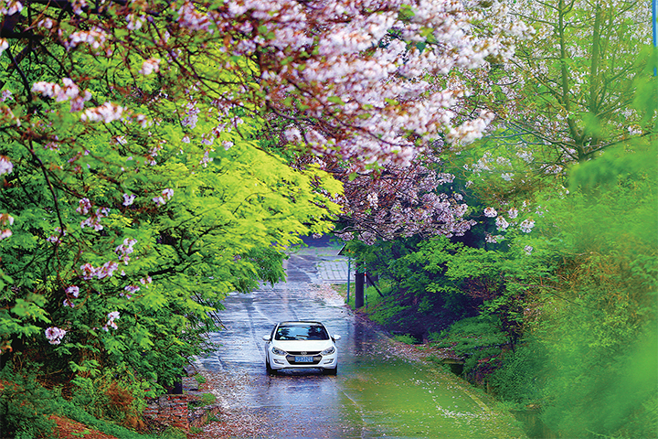 4月20日,在軹城鎮(zhèn)趙莊村,車輛陸續(xù)從潮濕的路面駛過。