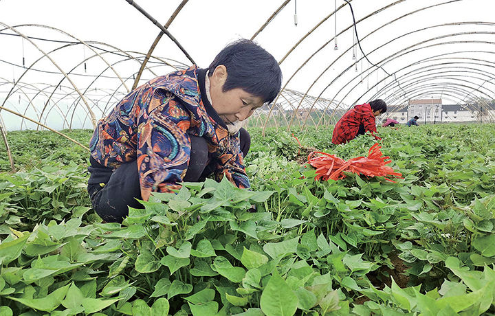 4月21日,在久久豐紅薯苗繁育基地,工人正在采紅薯苗。該基地日售賣(mài)紅薯苗達(dá)40萬(wàn)棵。