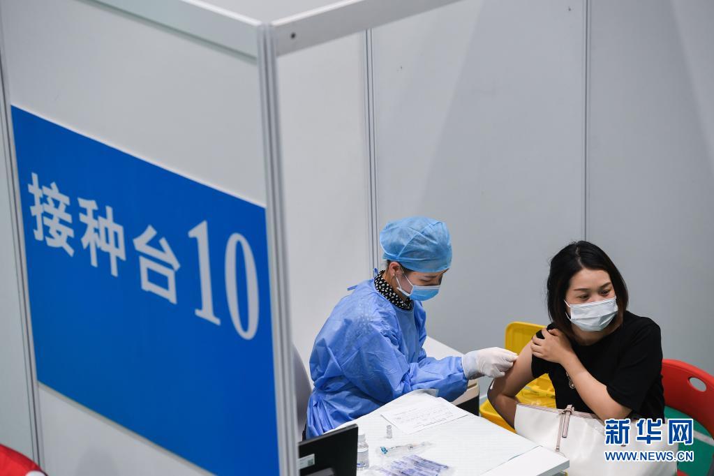 3月29日,在深圳市南山區(qū)南山文體中心的臨時(shí)接種點(diǎn),華中科技大學(xué)協(xié)和深圳醫(yī)院的醫(yī)護(hù)人員為居民接種新冠疫苗。新華社記者 毛思倩 攝