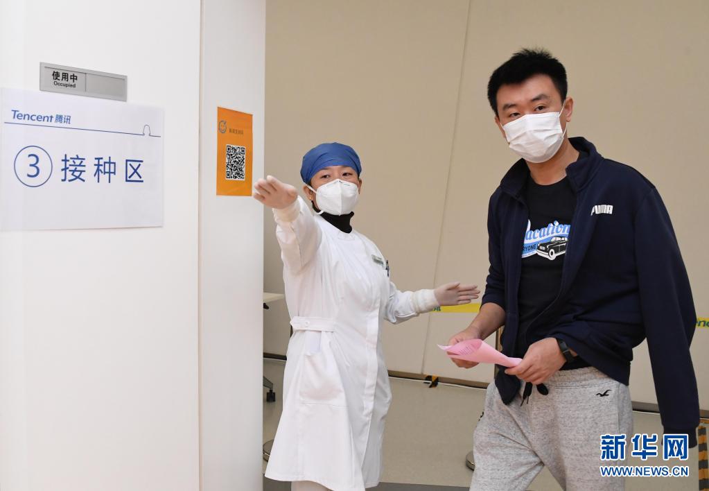 2月22日,在北京市海淀區(qū)中關(guān)村軟件園二期一家企業(yè)內(nèi)的臨時(shí)接種點(diǎn),醫(yī)護(hù)人員(左)引導(dǎo)企業(yè)員工接種新冠疫苗。新華社記者 任超 攝
