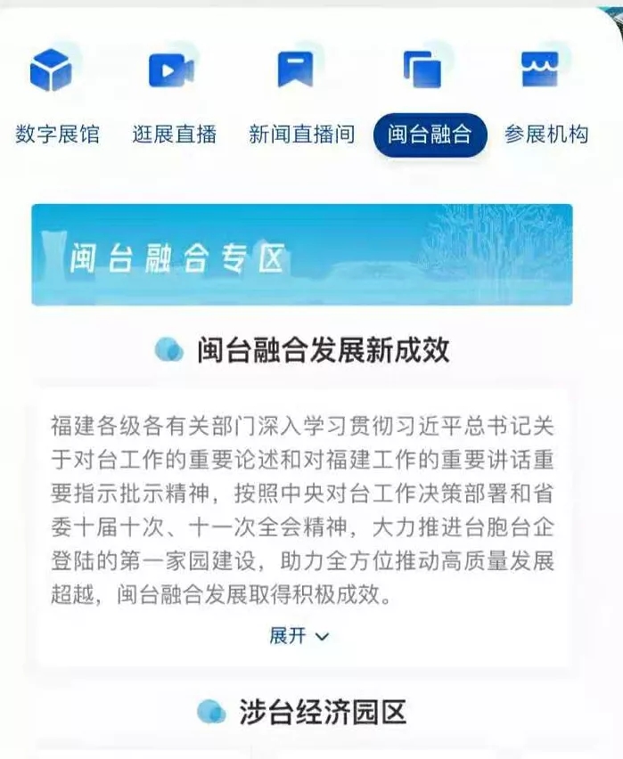 “云上峰會”特色平臺設(shè)置了“數(shù)字展館”“逛展直播”“新聞直播間”“閩臺融合”“參展機構(gòu)”五個模塊。