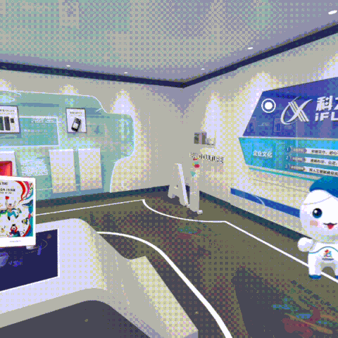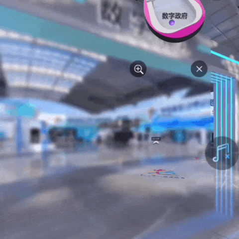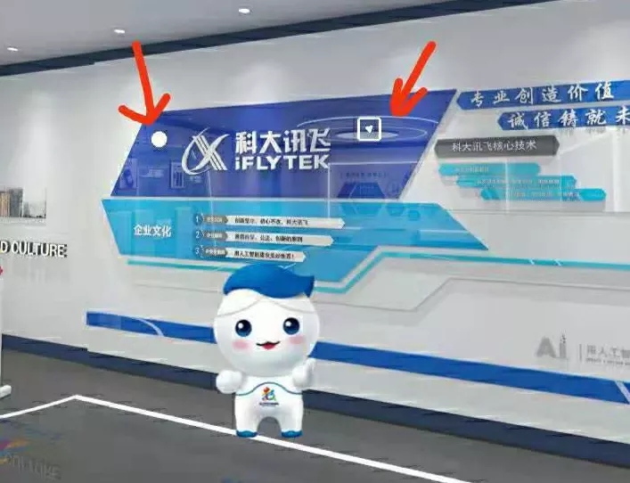 打開“數(shù)字治理”板塊的科大訊飛股份有限公司,我們直接到達了科大訊飛展區(qū),屏幕上有兩個白色按鈕,一個是關(guān)于視頻的按鈕,還有一個是關(guān)于文字介紹的按鈕。
