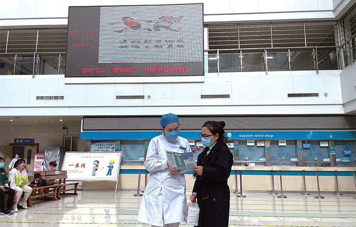 醫(yī)務(wù)人員正在給就醫(yī)群眾講解醫(yī)?;鹣嚓P(guān)政策