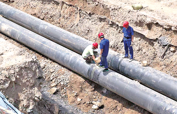 5月11日,在商業(yè)城蟒河橋下城市供熱管網(wǎng)施工現(xiàn)場,工人正在加緊施工。