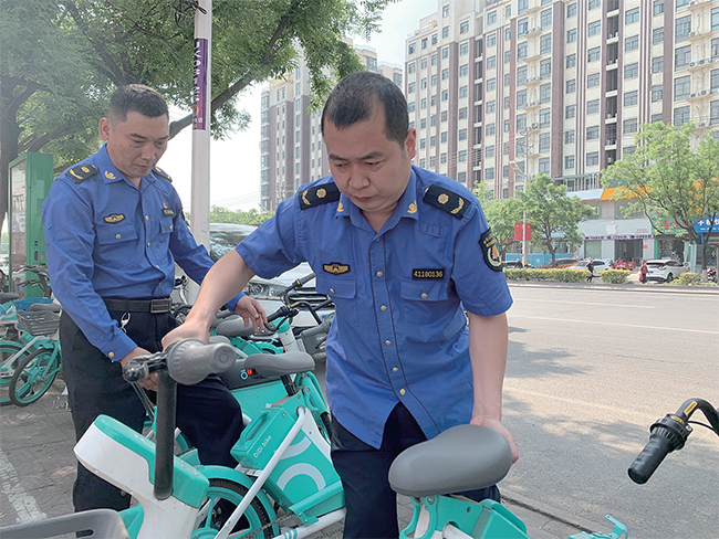 “我們先把腳手架抬到后面,然后把停在路邊的共享單車擺放整齊,車頭方向統(tǒng)一朝前?!?月11日上午,濟(jì)源城市綜合執(zhí)法局天壇綜合執(zhí)法大隊(duì)大隊(duì)長(zhǎng)狄衛(wèi)平正仔細(xì)清理著主干道商戶門(mén)前堆積的雜物。在狄衛(wèi)平負(fù)責(zé)的轄區(qū),龍?zhí)渡鷳B(tài)園和龍?zhí)逗疤新穼W(xué)校、天壇宋莊學(xué)校周邊的流動(dòng)攤販,一直是整治工作的難點(diǎn)。“特別是到了周末人流量密集的時(shí)候,流動(dòng)攤販在此擺攤設(shè)點(diǎn),導(dǎo)致市民出行不便、車輛出入受阻,既影響了環(huán)境,也影響了市容?!钡倚l(wèi)平告訴記者,執(zhí)法工作人員的巡查監(jiān)管,有效治理了流動(dòng)攤販占道經(jīng)營(yíng)的不文明現(xiàn)象。