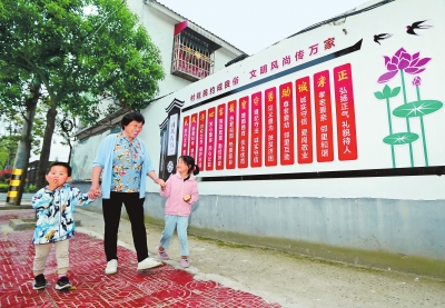 村民在淅川縣九重鎮(zhèn)鄒莊村村規(guī)民約墻前散步。記者 鄧放 王錚攝
