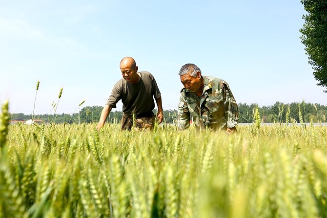 5月17日上午,北水屯居委會的村民正在麥田中查看小麥長勢。