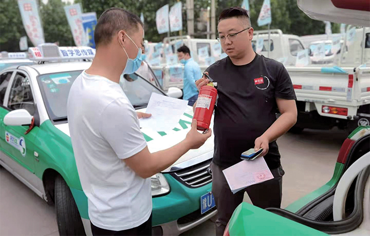 工作人員對出租車上的滅火器等設(shè)備進(jìn)行檢查