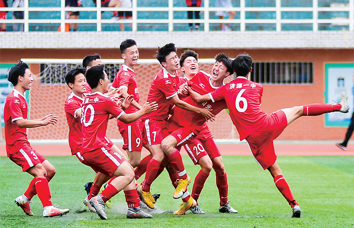濟(jì)源一中足球隊(duì)的隊(duì)員在歡慶勝利。