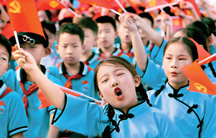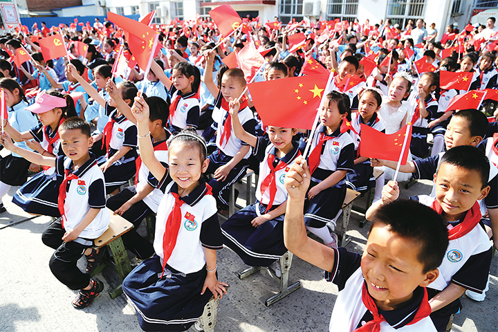 5月26日,在軹城鎮(zhèn)東添漿中心小學(xué),全體師生高唱革命紅歌,揮舞鮮紅黨旗國(guó)旗,表達(dá)對(duì)黨和祖國(guó)的崇高敬意和美好祝福。