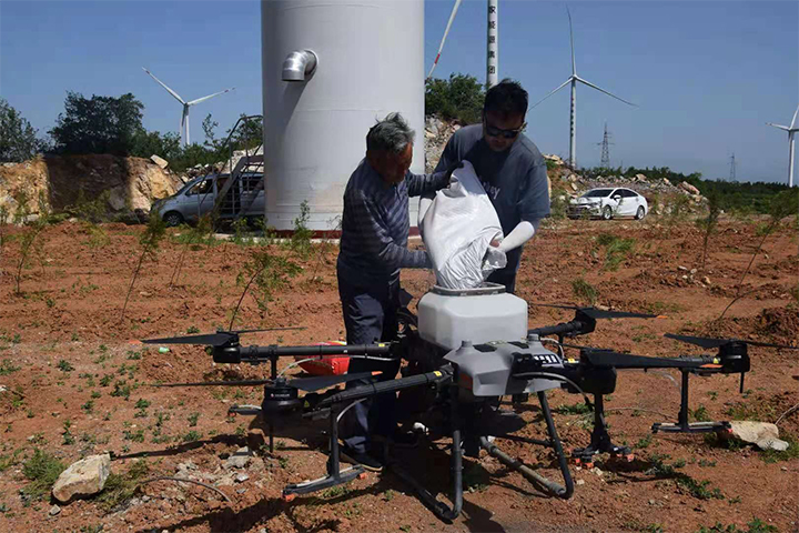 工作人員將樹種放入無人機(jī)種子箱