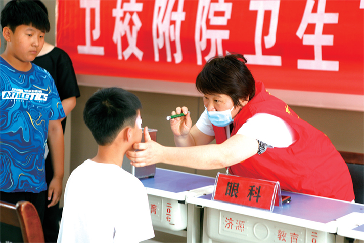 在孩子們期待的眼神中,濟源市衛(wèi)生學(xué)校附屬醫(yī)院眼科主任樊保紅緩緩走上講臺?!?019年,我省體檢135230人,檢出近視69769人,占比51.59%?!狈<t將近視的現(xiàn)狀向同學(xué)們娓娓道來,“2019年的數(shù)據(jù)顯示,濟源近視的發(fā)病率達62.06%?!?/p>